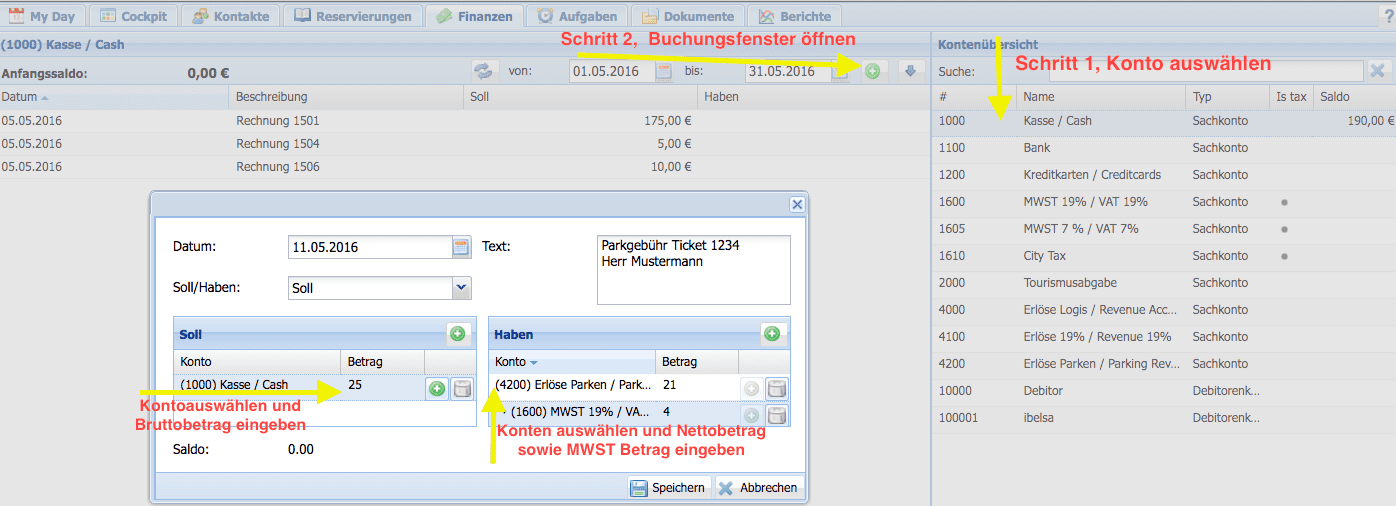 Ein Gast oder ein Passant zahlt an der Rezeption sein Parkticket von 25,-€, also eine Bareinnahme für Ihre Kasse. Klicken Sie rechts auf das Kassenkonto.