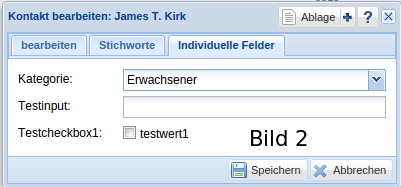 Dieses Feld wird mit den Kontakten verknüpft. D.h. alle hier definierten Felder tauchen in einem seperaten Tab bei jedem Kontakt auf.