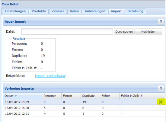 Gehen Sie in ‚Mein Hotel‘ auf den Reiter ‚Import‘ und gehen Sie in dem Bereich ‚vorherige Importe‘ mit der Maus über die entsprechende Importzeile, die Sie rückgängig machen möchten. Sobald Sie mit der Maus über die Zeile gleiten, erscheint am Ende der Zeile ein