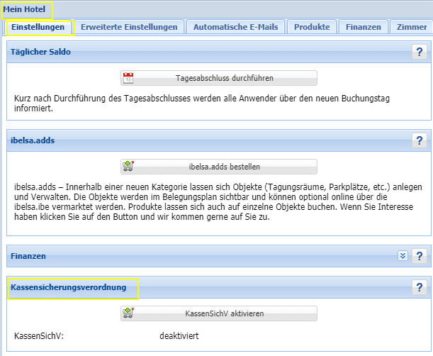 Zur Bestellung und Aktivierung Ihrer TSE wechseln Sie bitte zu <Mein Hotel>. Hier finden Sie unter dem Reiter Einstellungen den Punkt Kassensicherungsverordnung. Zum Aktivieren der Kassensicherungsverordnung klicken Sie bitte auf den Button <KassenSichV aktivieren>.