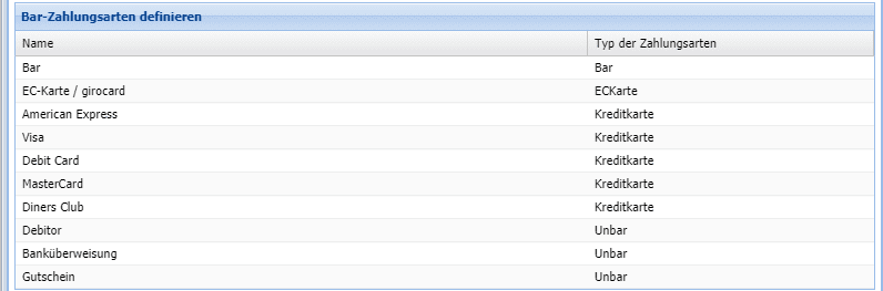 Nach der Vollständigen Zuordnung der Zahlungsarten ist dieser Teil der Konfiguration abgeschlossen. Die hier dargestellte Zuordnung ist als Beispiel angeführt. Falls Sie hier unschlüssig sind, haben wir Ihnen hier Hilfetext Zahlarten eine kurze Erklärung zu den unterschiedlichen Zahlarten hinterlegt. Sollte Sie trotzdem unsicher sein, welche Zahlart Sie wählen sollen, wenden Sie sich bitte an Ihren Steuerberater. Dieser kann Sie bei der Zuordnung der Zahlungsarten unterstützen.