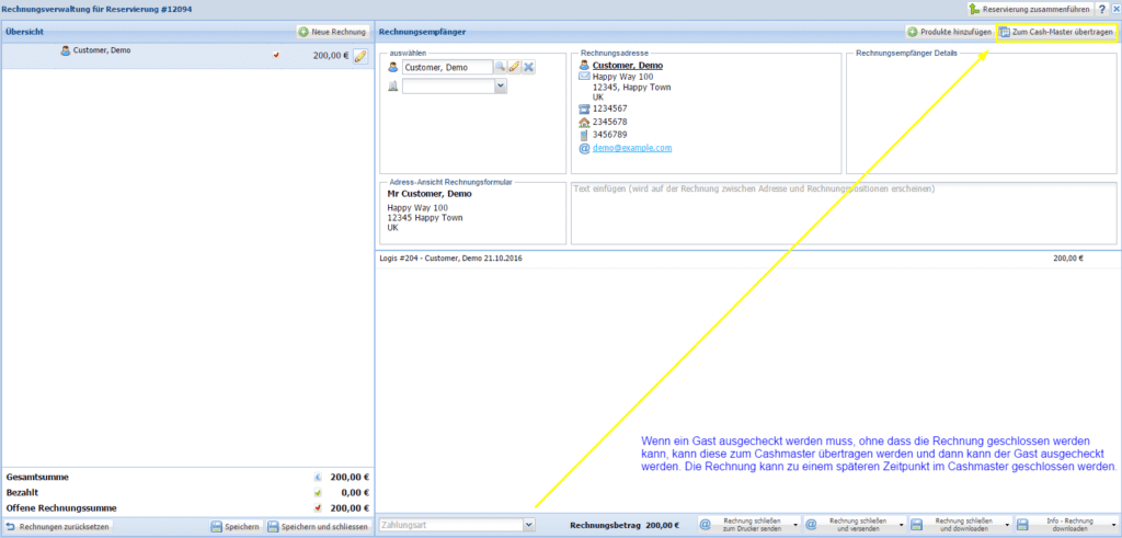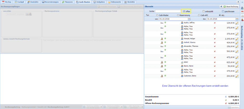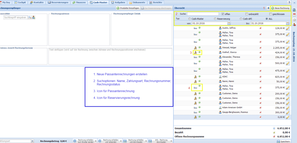 Die wichtigsten Funktionen des neuen Cashmaster Moduls sind, das Verschieben von Reservierungsrechnungen, das Erstellen von Passanten Rechnungen, die Debitorenverwaltung und eine erweiterte Rechnungssuchfunktion.