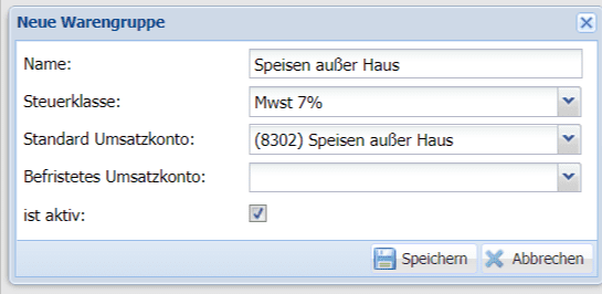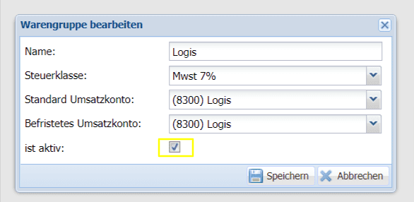 Die schon vorhandenen Warengruppen sind standardmäßig auf aktiv gesetzt, wenn eine Warengruppe deaktiviert werden soll, muss das Häkchen unter