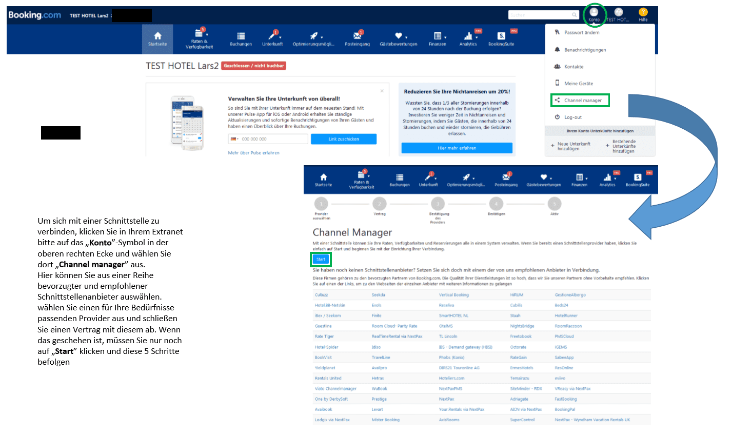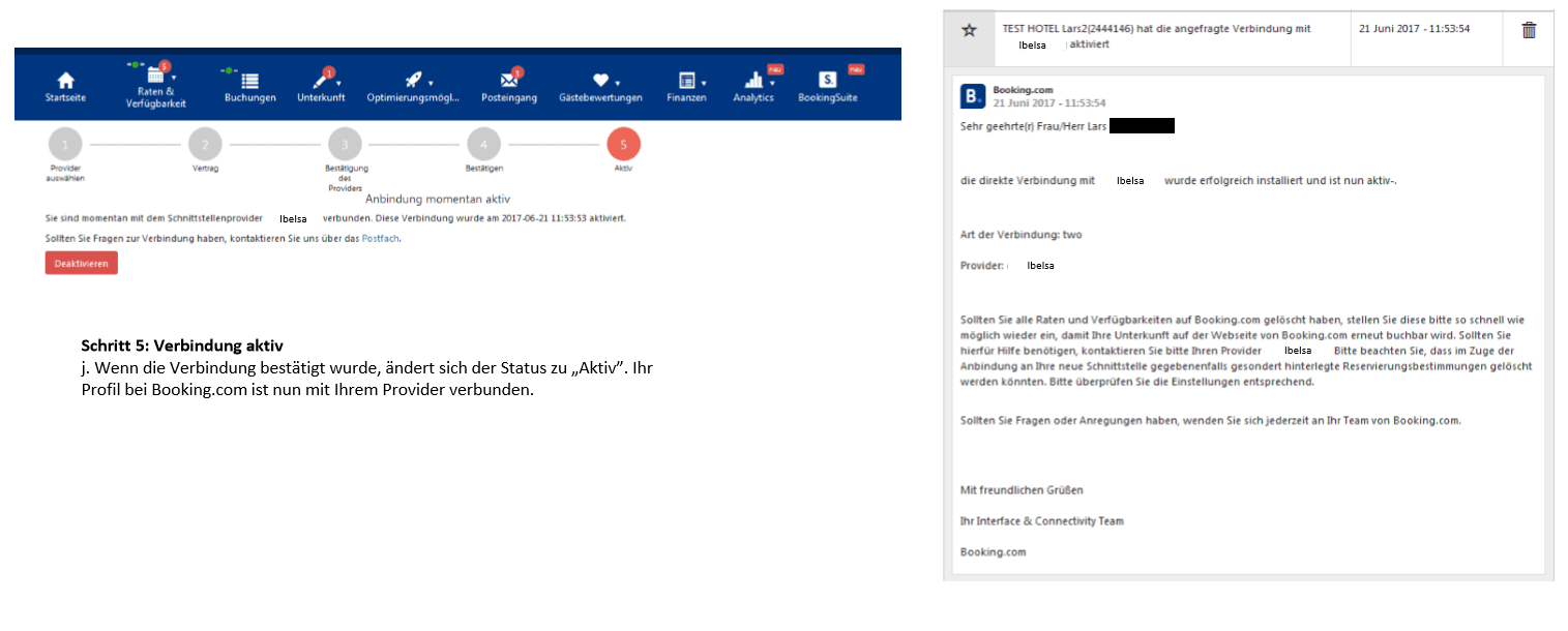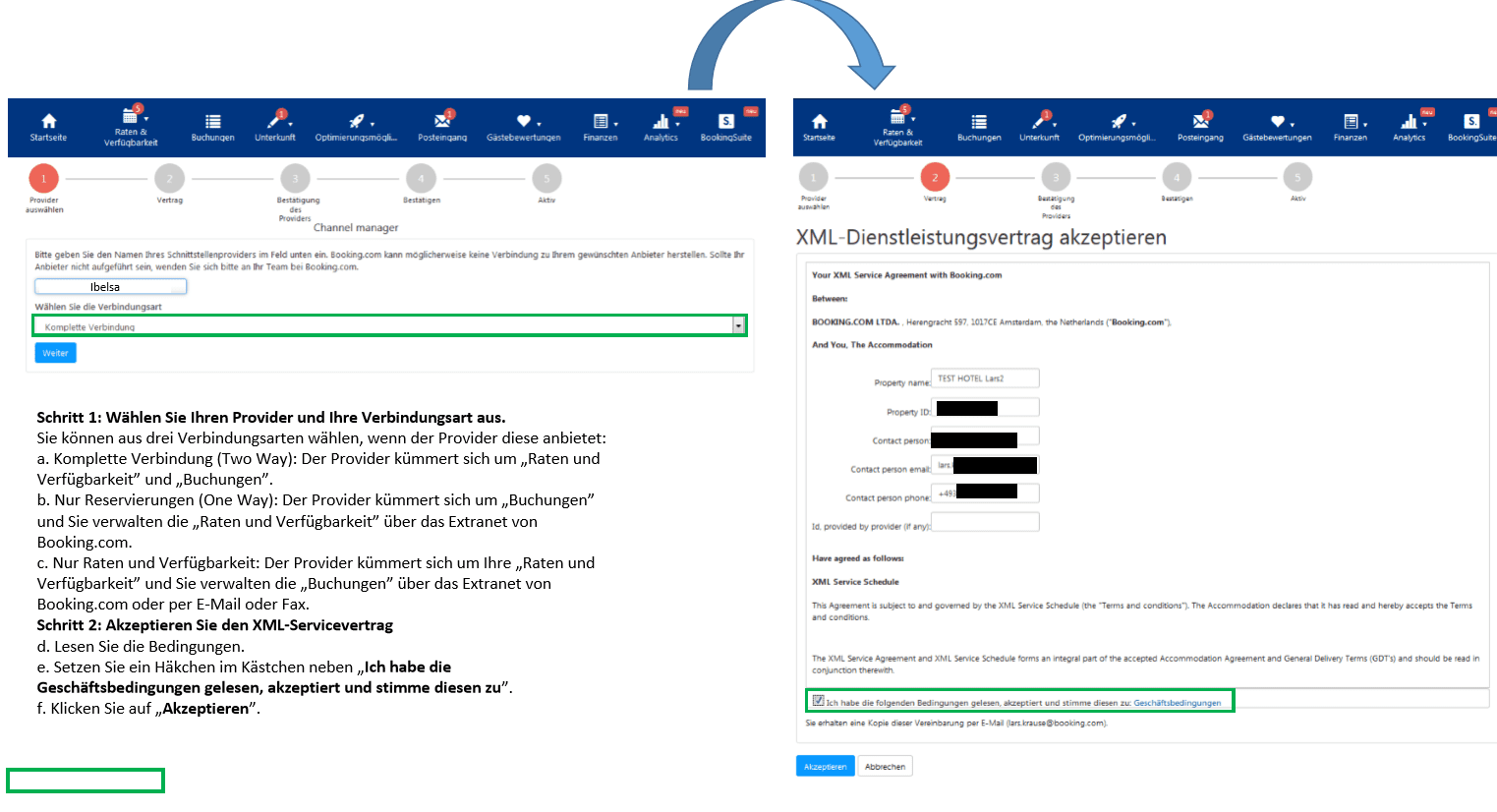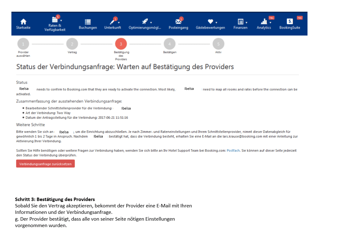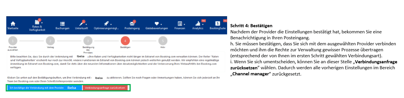 Mit dieser Anbindung können Sie Ihre Verfügbarkeiten und Preise aus ibelsa direkt zu booking.com senden und erhalten im Gegenzug die getätigten Reservierungen Ihrer Gäste. Die Anbindung wird mit Ihnen zusammen durch unser Supportteam durchgeführt. Die Preise für diese Anbindung entnehmen Sie bitte unserer Preisliste. Um die Anbindung bei Booking zu aktivieren, gehen Sie bitte wie folgt vor: