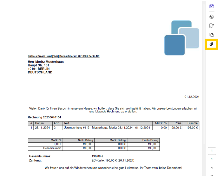Wenn Sie das Rechnungs-PDF beispielsweise mit dem Adobe Reader oder einem anderen PDF Reader öffnen, können Sie auf der rechten Seite auf das Büroklammer-Symbol klicken. Dort wird die integrierte Anlage, die die XML-Datei mit den Rechnungsinhalten enthält, angezeigt.