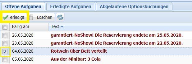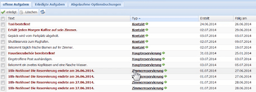 Hier lassen sich alle zu erledigende Aufgaben anzeigen oder bearbeiten. Zusätzlich werden alle nicht angereisten Gäste (No-Shows) und alle abgelaufenen Optionsbuchungen gesammelt.