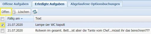 Das Modul ist in drei Registerkarten aufgeteilt: “offene Aufgaben”, “erledigte Aufgaben” und “abgelaufene Optionsbuchungen”.