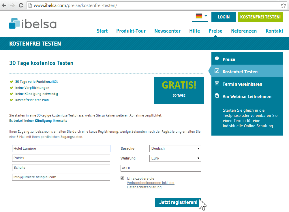 Herzlich willkommen zur Einführung in Ihre Hotelmanagement-Software ibelsa.rooms. Um sich für eine kostenlose, 30-tägige Testversion ohne anschließende Vertragsbindung zu registrieren, besuchen Sie die ibelsa-Homepage unter www.ibelsa.com. Wählen Sie anschließend auf der Startseite Ihre Sprache aus und klicken Sie auf KOSTENFREI TESTEN!
