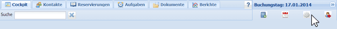 Die Startansicht wird als Cockpit bezeichnet und verschafft Ihnen einen Überblick über die momentanen Aktivitäten in Ihrem Hotel. Daneben stehen Ihnen die Reiter Kontakte, Reservierungen, Aufgaben, Dokumente und Berichte zur Verfügung. Mit diesen Funktionen können Sie die Aktivitäten am Kundenempfang Ihres Hotels steuern. Bevor das Programm verwendet werden kann, sollten Sie einige Grundeinstellungen für Ihr Hotel vornehmen. Darunter fallen z.B. die Informationen über Ihre Produkte, Raten und Zimmer. Um die Einstellungen vornehmen zu können, wählen Sie im Cockpit den Menüpunkt Mein Hotel. Klicken Sie dafür auf das Zahnrad am rechten Bildrand.