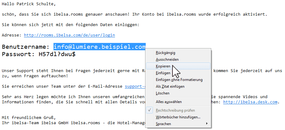 Kopieren Sie nacheinander den Benutzernamen und das Passwort in die Zwischenablage Ihres Computers und fügen Sie sie in die Anmeldemaske auf www.ibelsa.com. Anschließend lädt das Programm den Startbildschirm erneut.