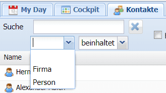 Diese Funktion erleichtert Ihnen die Suche in den Kontakten. Ab sofort können Sie gezielt nach einer Person oder Firma suchen und direkt entscheiden, ob der Suchbegriff mit “beinhaltet” oder “beginnt” gefiltert werden soll.