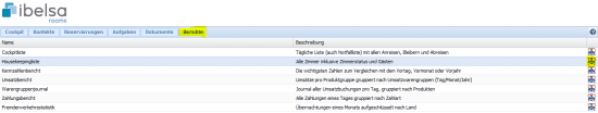 Die Housekeepingliste finden Sie auf dem Reiter ‚Berichte‘ in der Anwendung von ibelsa.rooms. Über das Drucksymbol am Ende der Zeile lässt sich der Bericht im PDF Format generieren und ausdrucken.