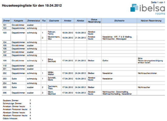 Geben Sie die Housekeepingliste einfach morgens Ihrer Hausdame oder Reinigungskraft und sie / er hat alle Informationen direkt auf einen Blick: Welche Zimmer sind sauber oder schmutzig und in welchem Zimmer reist ein Gast an oder ab.