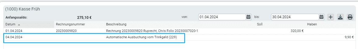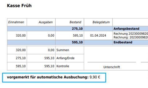 Bei Buchungstagwechsel werden diese Beträge automatisch aus der Kasse ausgebucht und ein manueller Kassenbeleg generiert.