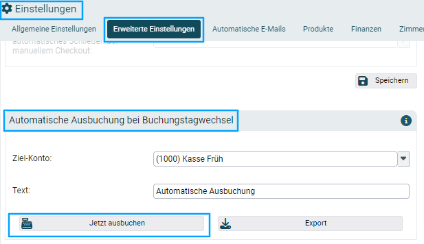 Unter den erweiterten Einstellungen – automatische Ausbuchung bei Buchungstagwechsel, das Fibukonto auswählen, von dem das Trinkgeld automatisch ausgebucht werden soll und den entsprechenden Buchungstext definieren.