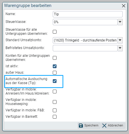 Die Konfiguration für die automatische Ausbuchung des Trinkgeldes muss bei den erweiterten Einstellungen und in der Warengruppe definiert werden.