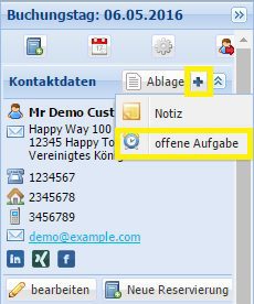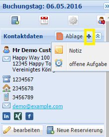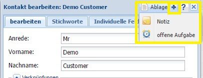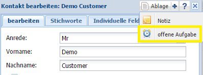 Klicken Sie auf das bei dem Ablage-Widget um eine neue Aufgabe für diesen Kontakt zu hinterlegen. Ein neues Dialogfenster öffnet sich, in dem Sie nun die Aufgabe mit Fälligkeitsdatum eingeben können. Diese erscheint auch direkt unter dem Reiter „Aufgaben“.