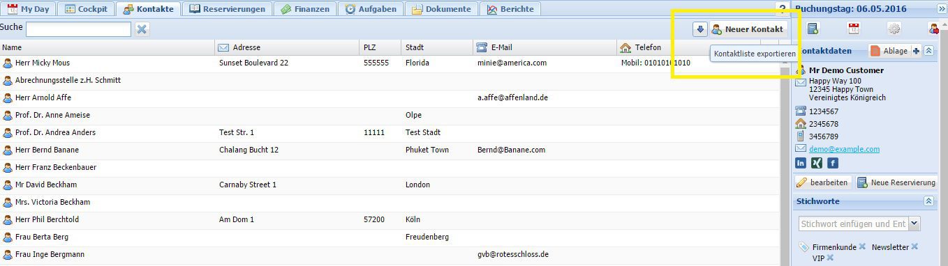 Auf dem Reiter Kontakte steht Ihnen der Datenexport Ihrer Kontakte zur Verfügung. Die Kontakte werden in einer CSV Datei exportiert, die sich z.B. mit Excel oder Open Office Calc öffnen lässt. Aus dieser Datei heraus können Sie die Daten für Mailings weiterverarbeiten.