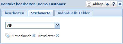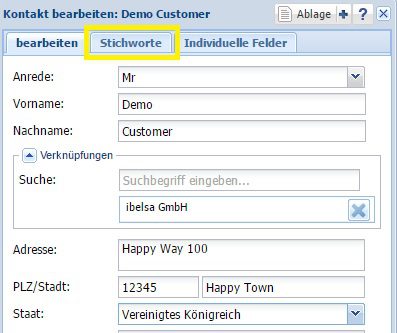 Sowohl auf den Kontaktkarteien, als auch auf den Firmenkarteien finden Sie den Reiter ‚Stichworte‘.