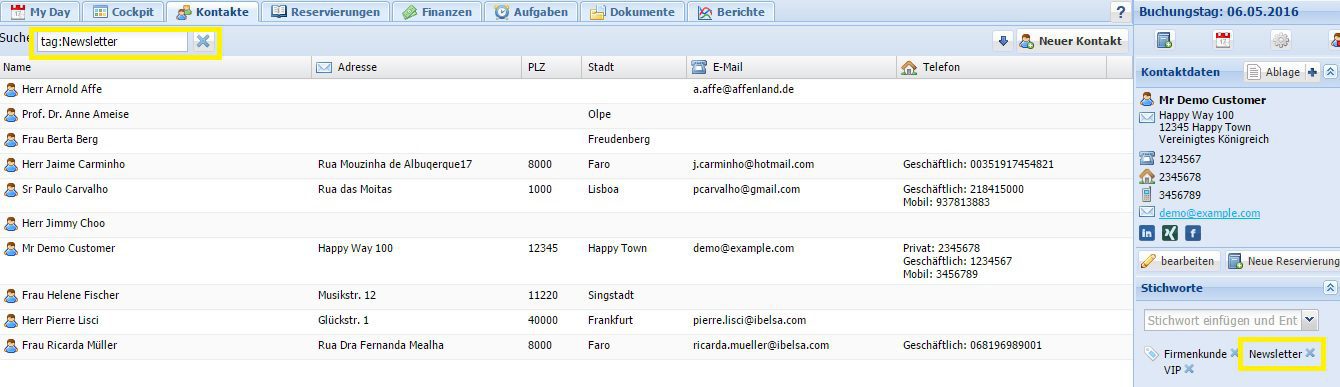 Sie möchten Ihre Gäste gezielt anschreiben und haben bereits mit den Stichworten Ihre Kontakte und Firmen kategorisiert. Um Ihre Kontakte und Firmen nach einem bestimmten Stichwort zu filtern, stehen Ihnen zwei Wege auf dem Reiter ‚Kontakte‘ zur Verfügung. 1. Möglichkeit Sie suchen sich eine Kartei heraus, die bereits das Stichwort, nach dem Sie filtern möchten, hinterlegt hat und klicken auf das entsprechende Stichwort in der Sidebar.