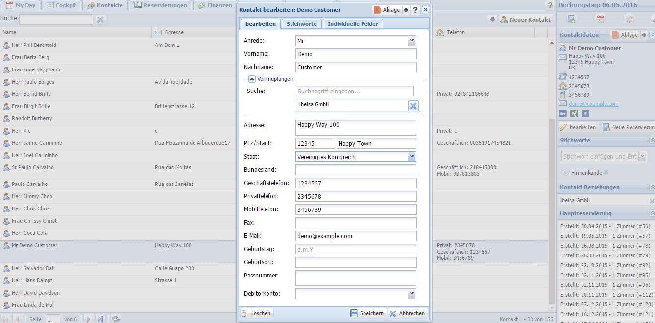 ibelsa.rooms bietet Ihnen ein komplettes CRM (Customer Relationship Management) System. Ziel des CRMs ist es, Ihre Kunden- und Gastbeziehungen langfristig zu pflegen um einen dauerhaften Erfolg Ihres Hotels zu sichern. Somit werden nicht nur die Adress- und Kontaktdaten Ihrer Kunden und Gäste gepflegt, sondern auch ihre Präferenzen, Wünsche und Beziehungen zu anderen Karteien. Sie sehen auf einen Blick, welche Zimmerwünsche ein Gast hat oder bei welcher Firma der Gast arbeitet. Eine Mehrfachverknüpfung der Karteien ist möglich. Somit können Sie alle Kontakte einer Firma mit der Firmenkartei verknüpfen und haben dadurch alle Mitarbeiter einer Firma im Überblick. Durch Stichworte können wichtige Informationen zum Kunden hinterlegt und wieder abgerufen werden. Somit können Sie einfach und flexibel Wünsche und Präferenzen des Gastes wie z.B. gewünschte Zimmermerkmale, den VIP Status, die Marktzuordnung, einen Mailingcode oder Housekeeping Infos hinterlegen. Über die Kartei können Sie sich auch jederzeit die Historie des Gastes abrufen und vorherige Reservierungen des Gastes einsehen. Zudem werden Ihnen über die Kartei auch zukünftige Reservierungen für den Gast angezeigt. Desweiteren können Sie Notizen und Aufgaben für die Kundenkartei setzen.