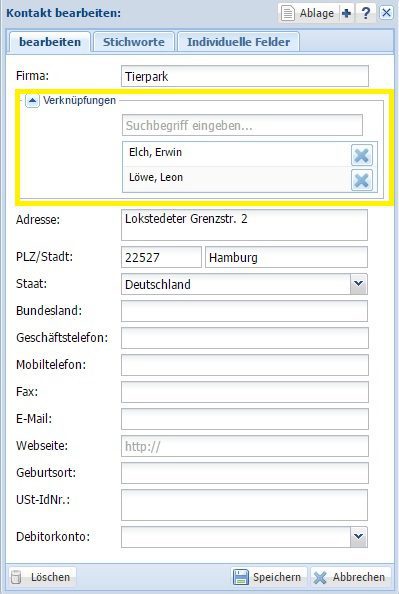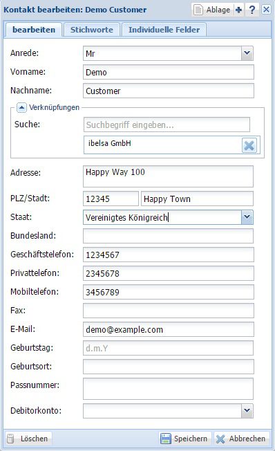 Sie können nun entweder einen Doppelklick auf der entsprechenden Kartei machen oder auf den Stift am Ende der markierten Zeile klicken um die Kartei zu öffnen. In der geöffneten Kartei können sie nun die Daten des Kontaktes oder der Firma entsprechend bearbeiten. Um die Änderungen zu speichern und die Kartei wieder zu schließen, klicken Sie bitte auf ’speichern‘. Wenn Sie die Änderungen nicht übernehmen möchten, klicken Sie bitte auf ‚abbrechen‘.