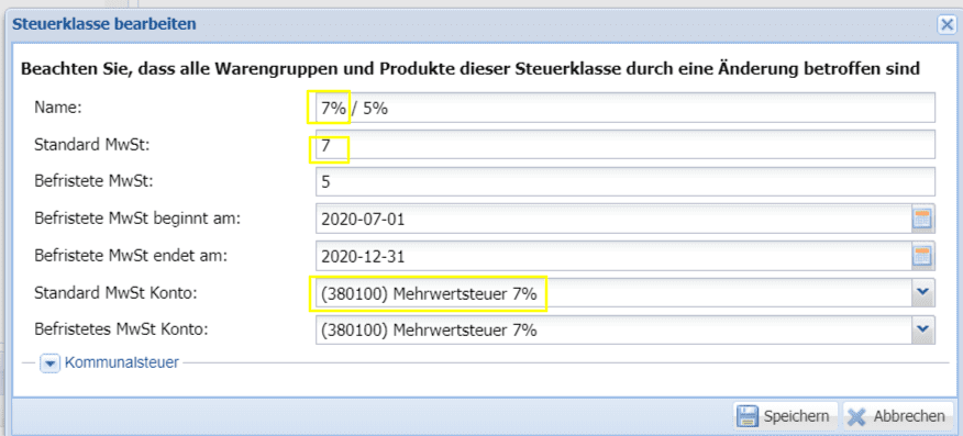 Zum 31.12.2020 endet die Corona Mehrwertsteuersenkung, allerdings ist der reduzierte Mehrwertsteuersatz für Speisen weiterhin bis zum 30.6.2021 gültig. Um einen reibungslosen Übergang zu garantieren, muss die aktuell vorhandene Mehrwertsteuer Klasse von 19%/5% auf 7% / 5% geändert werden.
