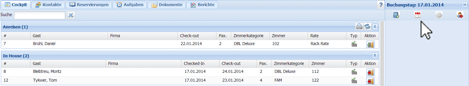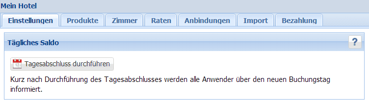 Tipp: Wenn Sie den Tagesabschluss mit dieser Funktion durchgeführt haben, ändert sich das Datum innerhalb des Programms auf den nächsten Tag. Dieser Vorgang kann nicht rückgängig gemacht werden. Führen Sie die Funktion daher erst aus, wenn alle Gäste des aktuellen Tages eingecheckt haben. Andernfalls erscheinen sie als ’no-shows‘.