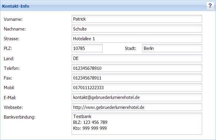 Unter dem Punkt Kontakt-Info können Sie die genauen Daten wie Adresse, Bankverbindung usw. angeben. Abgesehen vom Namen des Inhabers werden alle Kontakt-Informationen in der Fußzeile Ihres Schriftverkehrs, wie z.B. Buchungsbestätigungen oder Rechnungen, übernommen.
