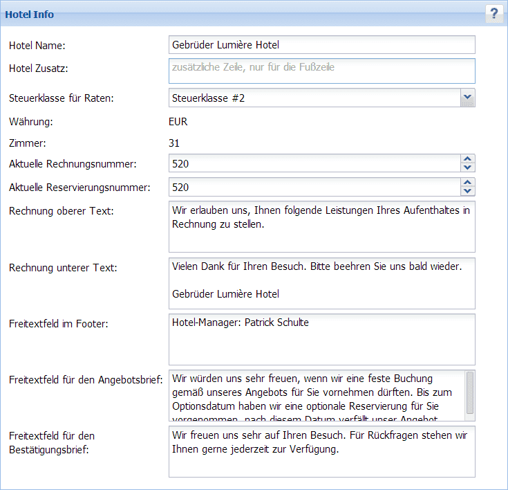 Der Punkt Hotel-Info ist für diverse Angaben Ihres Geschäftsbetriebs vorgesehen.