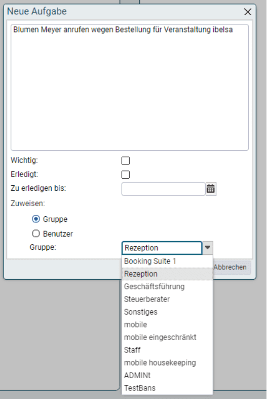 Die Zuweisung einer Aufgabe kann auch erfolgen, wenn eine Aufgabe bei einer Reservierung angelegt wird.