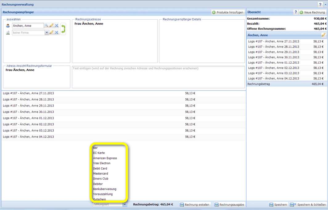 Nachdem Sie eine Zahlart gewählt haben, klicken Sie bitte auf ‚Rechnung erstellen‘. Dadurch wird die Zahlungsart im System gebucht und eine Rechnung mit Rechnungsnummer erstellt.