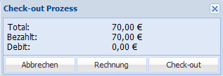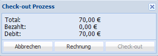 In diesem Beispiel hat der Gast seine Rechnung noch nicht beglichen – das Debit steht auf 70,00 € – und der Gast kann noch nicht ausgecheckt werden. Das Feld „Check-out“ ist ausgegraut und kann nicht angeklickt werden. In diesem Fall müssen sie zuerst die Rechnung des Gastes über „Rechnung“ öffnen und die Rechnung des Gastes erstellen. Nach dem Schließen der Rechnung und erneutem Klicken des Check-out Buttons kann der Gast nun ausgecheckt werden.