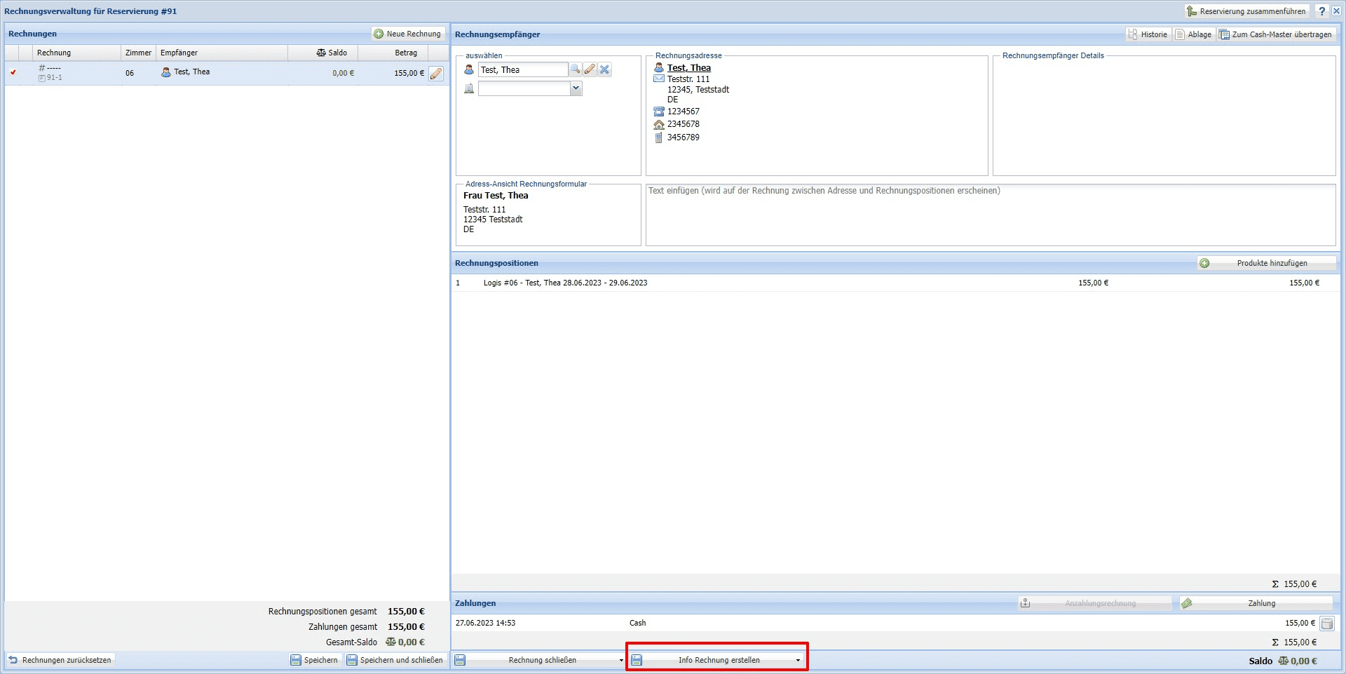 Gehen Sie in der gewünschten Rechnung und dem gewünschten Rechnungsfenster ganz unten rechts auf die Funktion ‚Info Rechnung erstellen‘ um eine Informationsrechnung zu drucken.