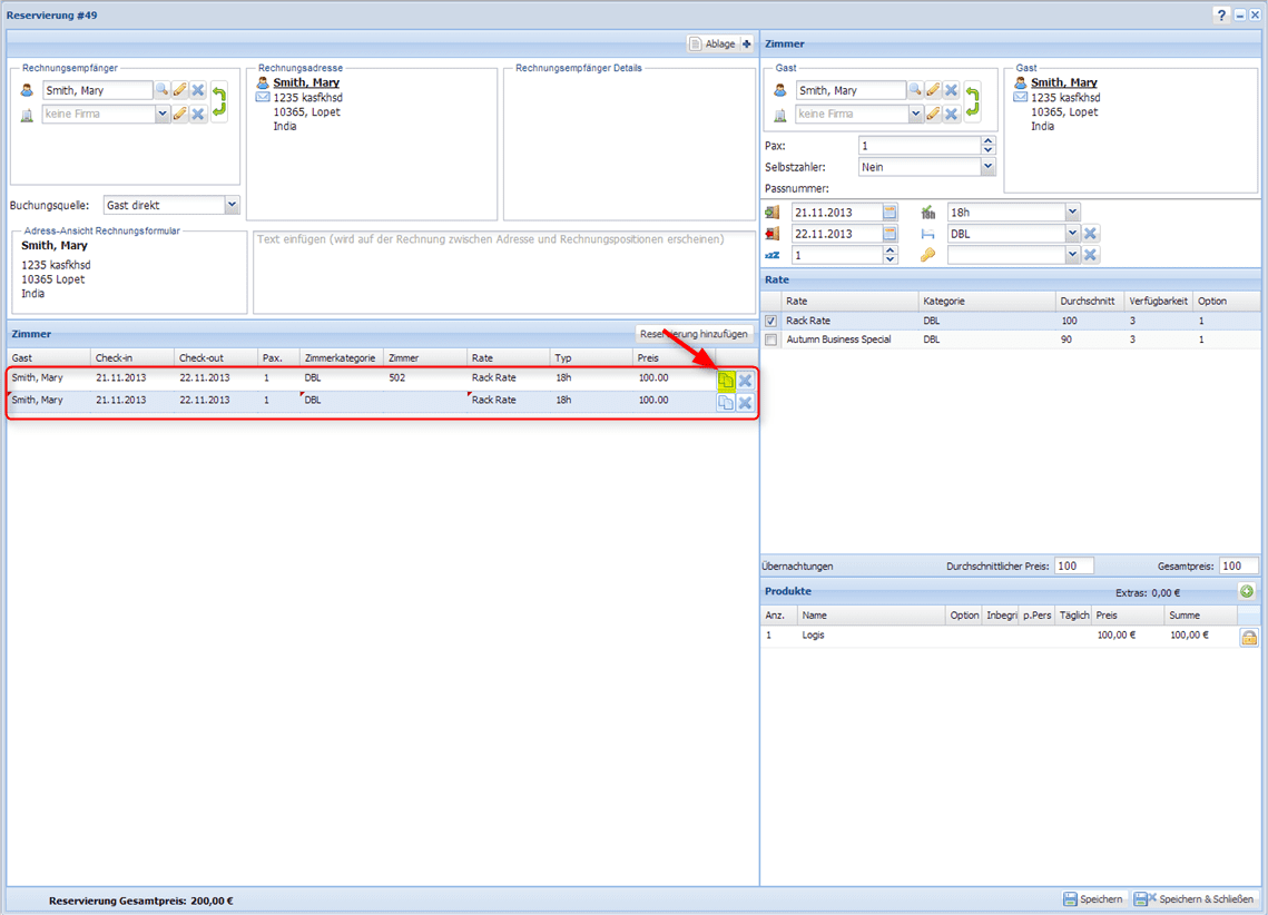 Legen Sie die Reservierung wie gewohnt an. Als Abreisedatum der Reservierung wählen Sie bitte den Tag, an dem die neue Rate / der neue Preis gelten soll. Kopieren Sie jetzt die Reservierung über das Kopiersymbol am Ende der ersten Zimmerreservierung und geben Sie bei der Kopie das Anreisedatum für den ersten Tag der neuen Rate / des neuen Preises ein. In der Kopie hinterlegen Sie nun die neue Rate / den neuen Preis.