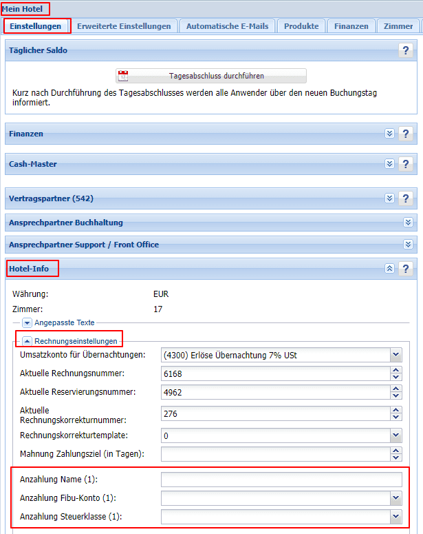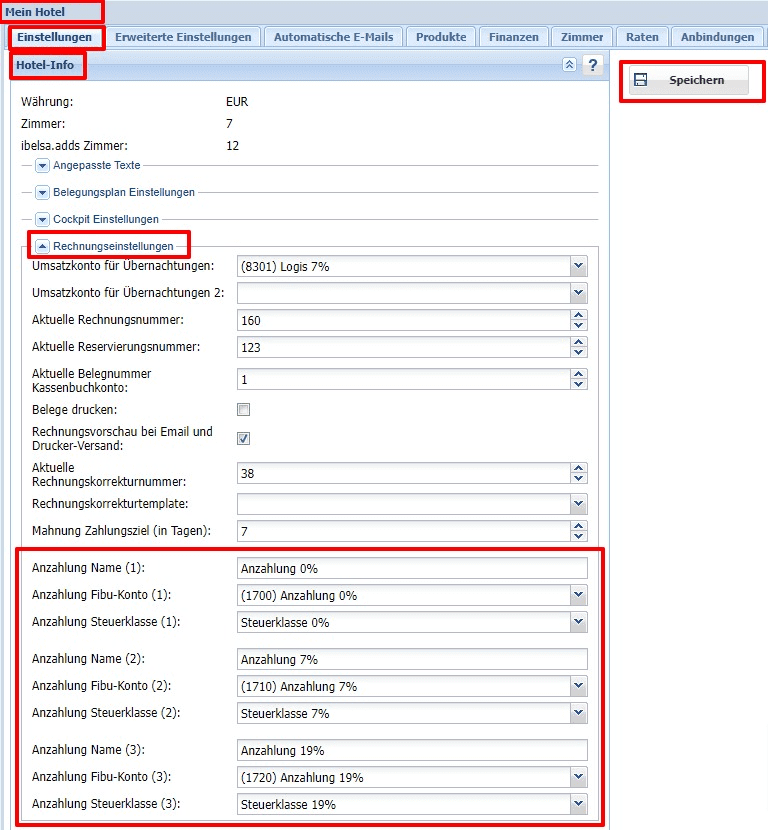 - Mein Hotel / Einstellungen / Hotel Info / Rechnungseinstellungen