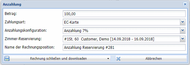Anzahlungen können sowohl in der Rechnungsverwaltung einer Reservierung, als auch im Cashmaster bei einer Passantenrechnung verbucht werden.