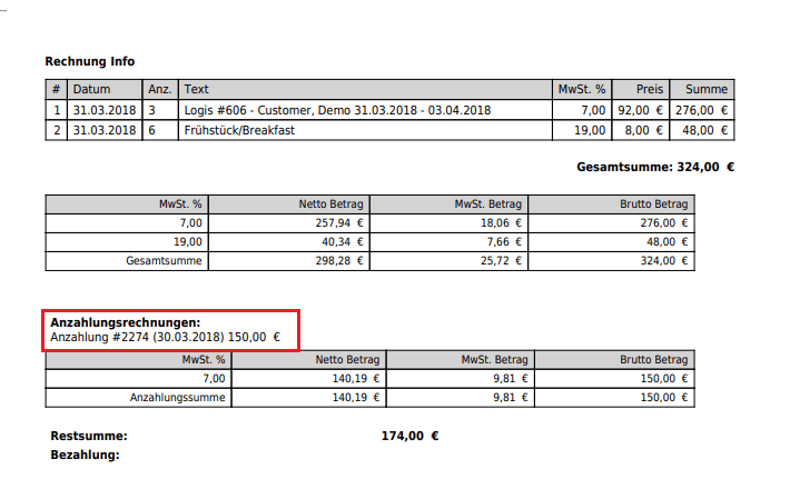 - Wenn mehrere Anzahlungen gebucht worden sind, wird jede Anzahlungsrechnungsnummer auf der Inforechnung und Endrechnung aufgelistet.