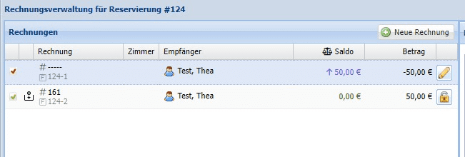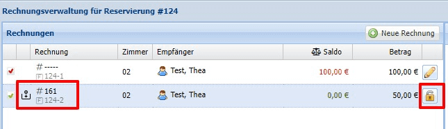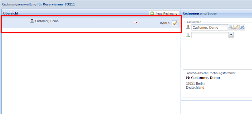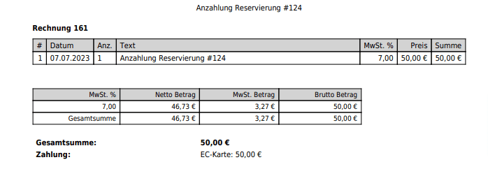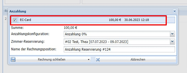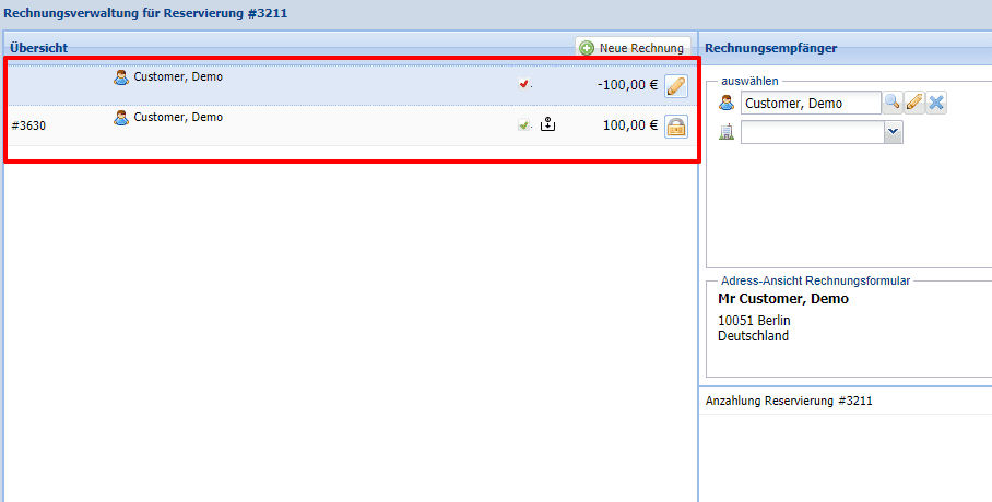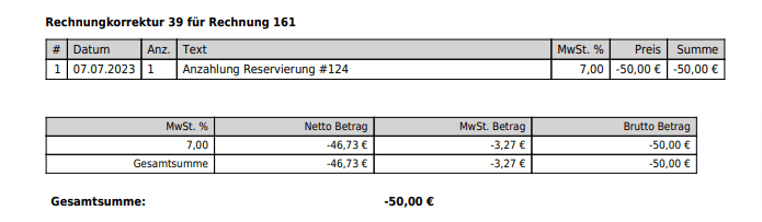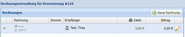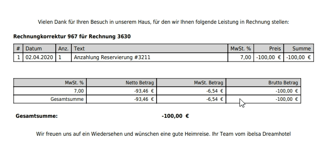 Diese kann für eine neue Reservierung des Gastes genutzt werden oder die Anzahlung kann dem Gast wieder zurück überwiesen werden, indem die Anzahlungsrechnung über das Schloss geöffnet wird. Der Saldo in der Reservierung ist dann null.