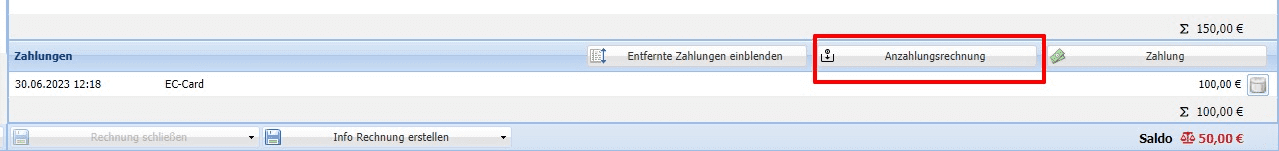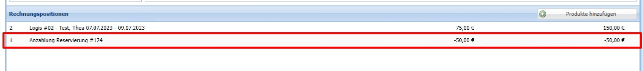 Auf der noch offenen Rechnung in der Rechnungsverwaltung wird die Anzahlung automatisch verbucht.