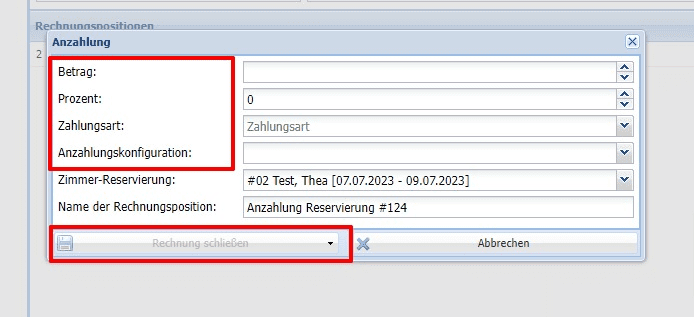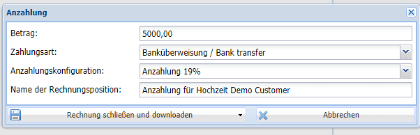 Ein weiterer Weg wäre, zuvor keine Zahlart zu speichern und sofort über den Weg der Anzahlungsrechnung zu gehen. Dort bitte alle Daten entsprechend eingeben, die Zahlungsart auswählen sowie eine Anzahlungskonfiguration und anschließend die Rechnung schließen.