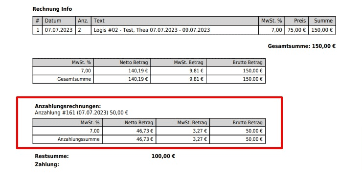 Auf der Inforechnung wird die Anzahlung getrennt ausgewiesen.
