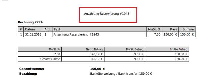 - Wenn das Finanzenmodul aktiviert ist, eine Anzahlungsrechnung über den vollen Endbetrag verbucht wurde und die Endrechnungssumme dadurch NULL ist, muss diese Rechnung dennoch mit einer Zahlungsart geschlossen werden, am besten mit Debitor oder Überweisung, so dass die Anzahlung in der Fibu korrekt ausgebucht wird. Ist die Aktion „Automatische Schließung der Rechnung bei Check-Out” aktiviert, wird auch die Nullsumme bei Endrechnungen von Anzahlungen automatisch geschlossen.