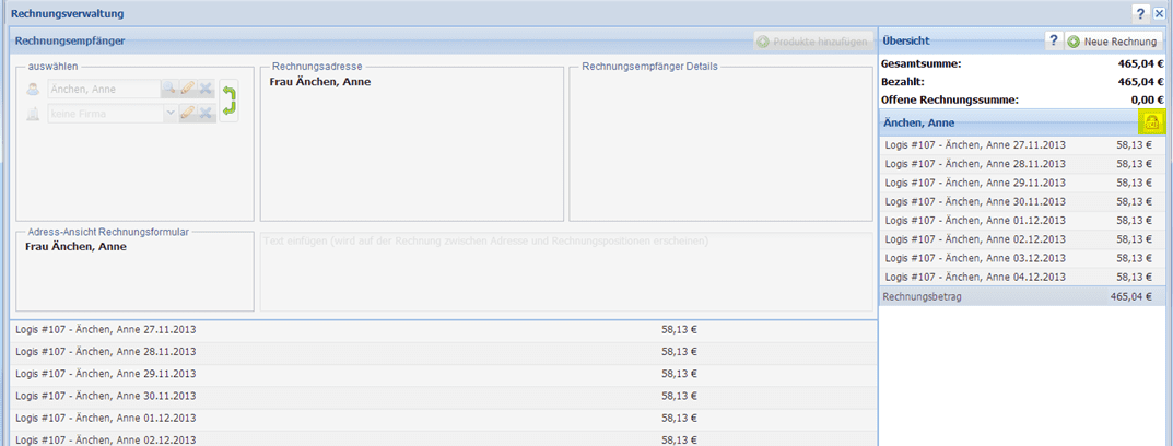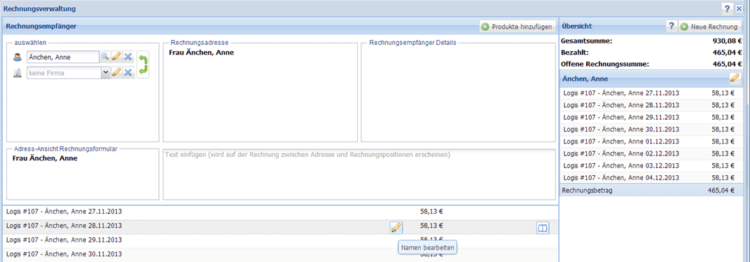- Die Rechnung wird wieder zur Bearbeitung geöffnet. Es können weitere Leistungen auf die Rechnung gebucht werden und es kann die Rechnungsanschrift korrigiert werden.
