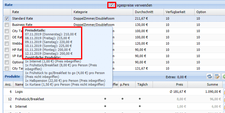 Wenn dies nur vereinzelt benötigt wird, kann dies auch in der Reservierung geändert werden. Alle schon angelegten Reservierungen haben weiterhin Durchschnittspreise und können nur manuell in der Reservierung auf Tagespreise verändert werden.