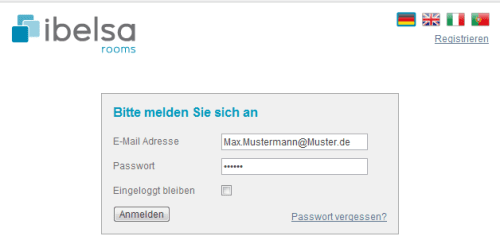 Öffnen Sie einen Webbrowser. Um eine bestmögliche Performance zu erreichen empfehlen wir Google Chrome. Gehen Sie über die URL https://rooms.ibelsa.com/de/user/login um sich im System anzumelden.