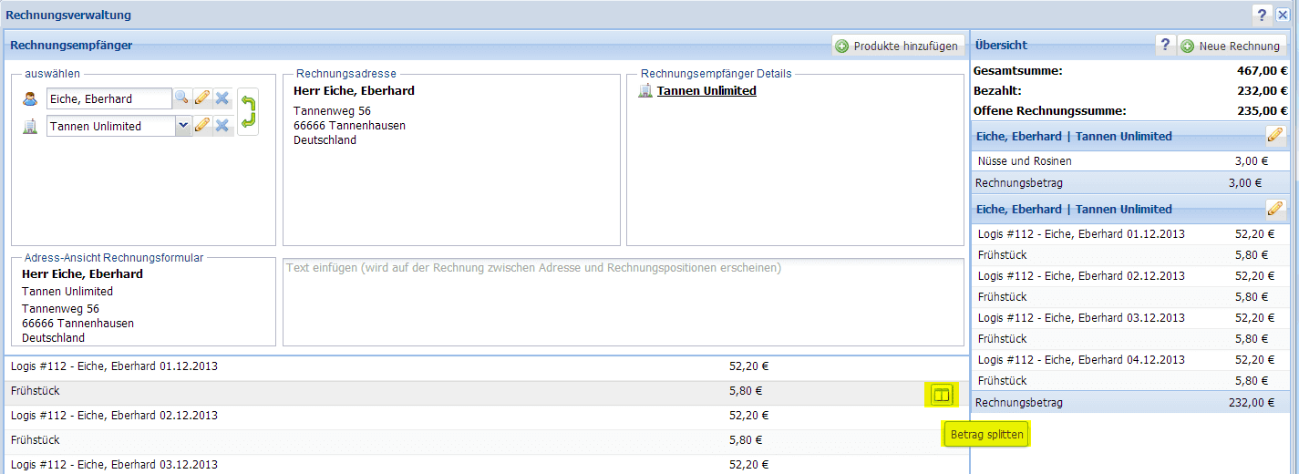 Sie befinden sich in der Rechnung eines Gastes (‚Wie öffne ich die Rechnung eines Gastes?‘) und möchten eine Rechnungsposition splitten, um z.Bsp. den Logisumsatz auf zwei Gäste aufzuteilen. Mit der Splitfunktion können Sie eine Rechnungsposten in zwei (oder mehr) Rechnungspositionen splitten.
