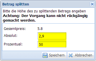 Ein neues Dialogfenster öffnet sich, in dem Sie nun eingeben können, welcher Betrag oder welcher Prozentsatz gesplittet werden soll.