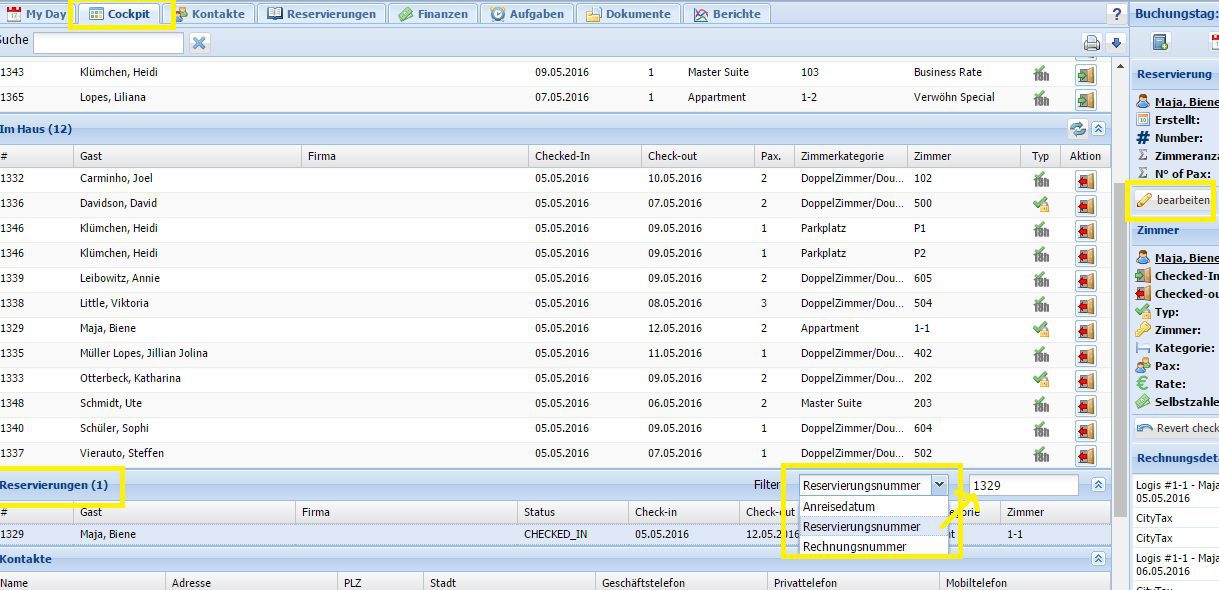 Sie suchen nach einer Reservierungsnummer um evtl. eine Reservierung zu ändern oder auch zu stornieren. Bitte gehen Sie auf den Reiter Cockpit und scrollen Sie von dort nach unten bis Sie auf die Überschrift Reservierungen stoßen. Rechts hiervon sehen Sie nun den Filter mit der Voreinstellung „Anreisedatum“. Klicken Sie rechts auf den kleinen Pfeil um das Dropdownmenü zu öffnen und wählen nun den Punkt „Reservierungsnummer“ aus. Im Suchfeld können Sie nun die gewünschte Nummer eingeben und mit Enter bestätigen. Der Gast/die Gäste oder Firma werden nun in der darunter liegenden Zeile aufgeführt. Per Klick werden nun alle relevanten Daten des Kontaktes/der Kontakte in der Sidebar aufgeführt. Klicken Sie nun auf „bearbeiten“ um die Reservierung wieder zu öffnen und um die gewünschten Änderungen vorzunehmen.