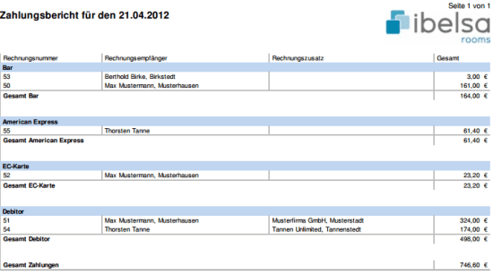 Pro Zahlung wird die Rechnungsnummer, der Rechnungsempfänger mit Rechnungszusätzen (Kontakt oder Firma), sowie der Betrag der Zahlung aufgelistet. Wird eine geschlossene Rechnung wieder geöffnet, wird die Zahlart intern direkt verrechnet. Diese Korrektur läuft im Zahlungsbericht nicht mit auf.